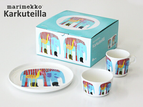 [marimekko(マリメッコ)] キッズセット Karkuteilla(コップ・ボウル・プレート) 可愛いデザインの動物達が描かれたコップ・ボウル・プレートのキッズセットになります。